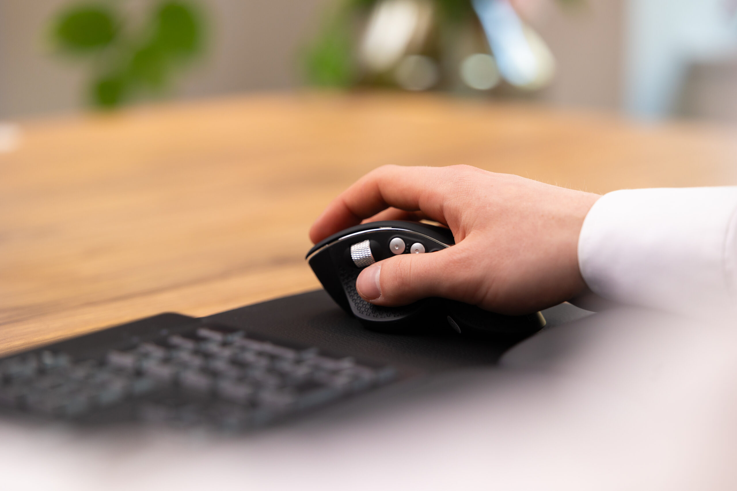 Een trackball vermindert de pronatie en polsbeweging ten opzichte van een platte muis en beperkt schouderabductie (je arm blijft dichter bij je lichaam). Daardoor neem je sneller een neutrale werkhouding aan en verlaag je de spierspanning in onderarm, schouder en nek. Zeker in combinatie met een compact toetsenbord werk je binnen schouderbreedte en hoef je minder te reiken. Resultaat: meer controle, minder onnodige bewegingen en meer comfort tijdens lange werkdagen.