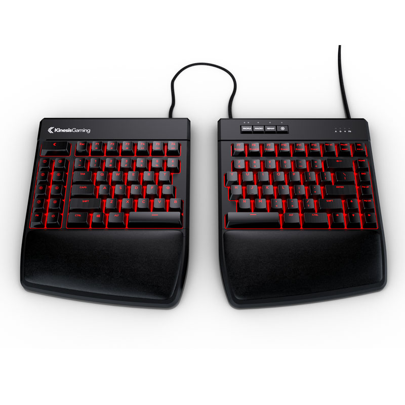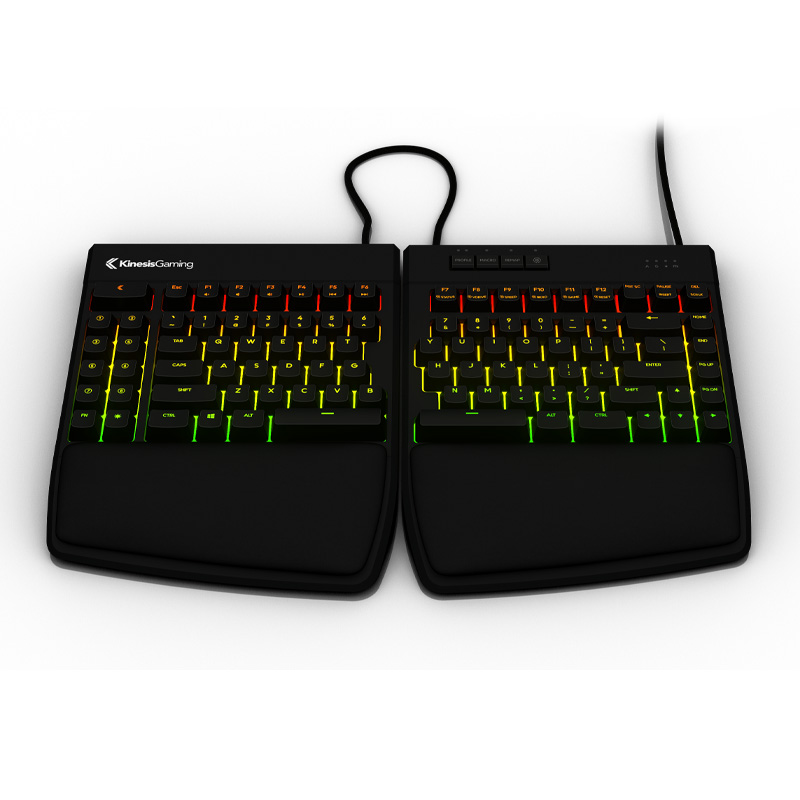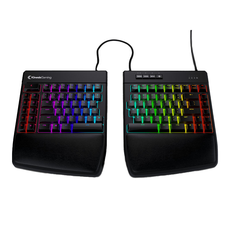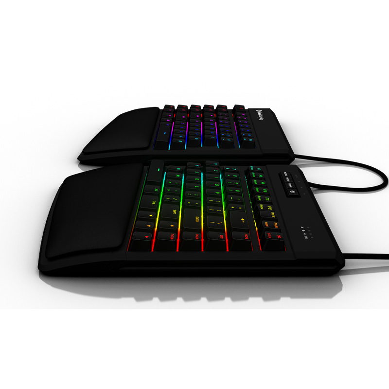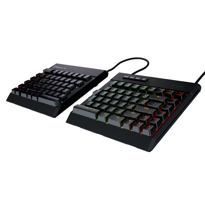 The Kinesis Freestyle Edge RGB keyboard is a split, ergonomic gaming keyboard with per-key RGB lighting, powerful onboard macros and SmartSet programming. This keyboard uses the familiar Cherry switches and lets you precisely position the halves for greater comfort, space and control.