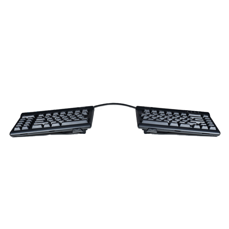Door je toetsenbord in het midden te ‘tenten’ verminder je voorarmpronatie (het platdraaien van de onderarm) en houd je je polsen neutraler. Dat voelt merkbaar rustiger in handen, onderarmen en schouders vooral tijdens lange typesessies. Omdat links en rechts onafhankelijk instelbaar zijn, kun je per zijde de hoek kiezen die het beste bij jou past.