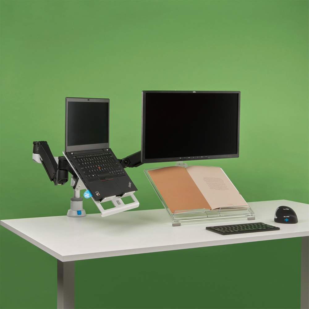 Werk je met laptop én extern scherm? Met de R-Go Morelia Laptophouder breng je het laptopscherm op dezelfde (gezonde) hoogte, wat helpt om nek- en schouderklachten te verminderen en een rechtere houding te ondersteunen. De oplossing hangt aan je monitorarm, houdt je bureau overzichtelijk en sluit aan bij R-Go’s focus op CO₂-neutraal ontworpen monitorarm-oplossingen en SMART-functies zoals een rotatiestop.