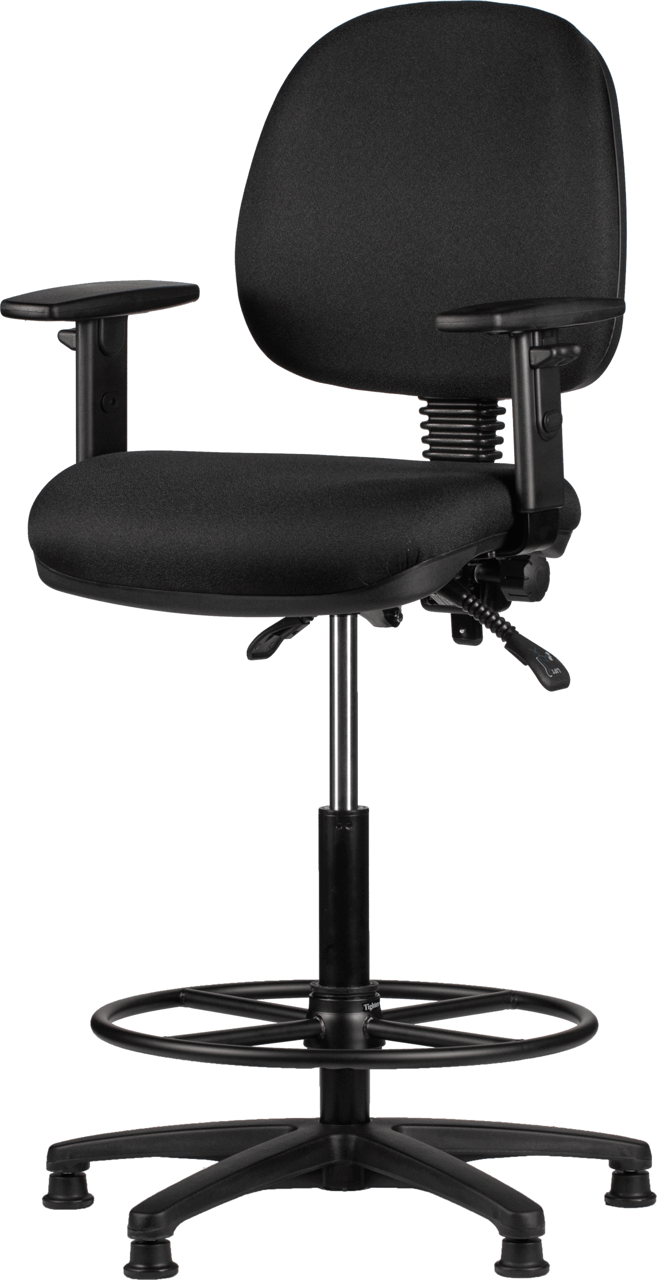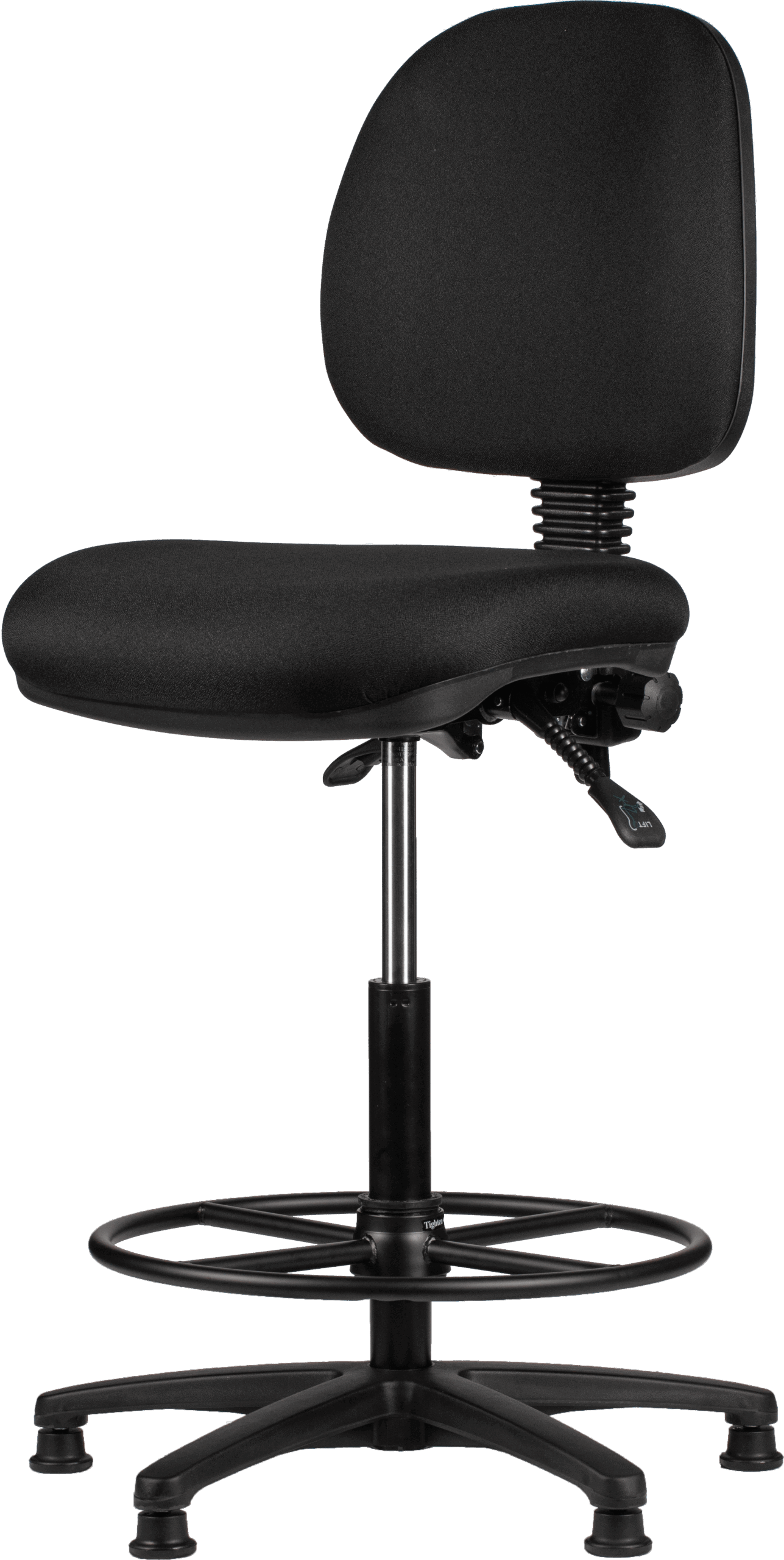 Het grote verschil met een “gewone” bureaustoel is de combinatie van hogere zithoogte en voetenring. Daardoor kun je ook aan een hoge balie netjes zitten met je voeten ondersteund, in plaats van bungelende benen (wat al snel spanning geeft in bovenbenen en onderrug).