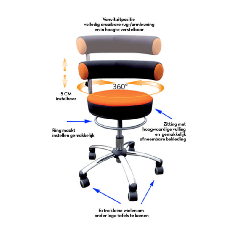 De Sanus Gezondheidsstoel met Verstelbare Rugleuning is een compacte gezondheidsstoel voor werk dicht bij je taak denk aan zorg, salon, lab of onderwijs. De ronde zitting geeft je maximale bewegingsvrijheid en nodigt uit tot kleine houdingswisselingen. Het zwarte kunstleder is hygiënisch, slijtvast en in een handomdraai schoon. De rugleuning stel je in hoogte precies af op jouw onderrug, zodat je ondersteuning krijgt waar je die het meest voelt. Daarnaast kan de rugleuning 360° draaien waardoor je gedurende dag kunt variëren van verschillende zithoudingen.