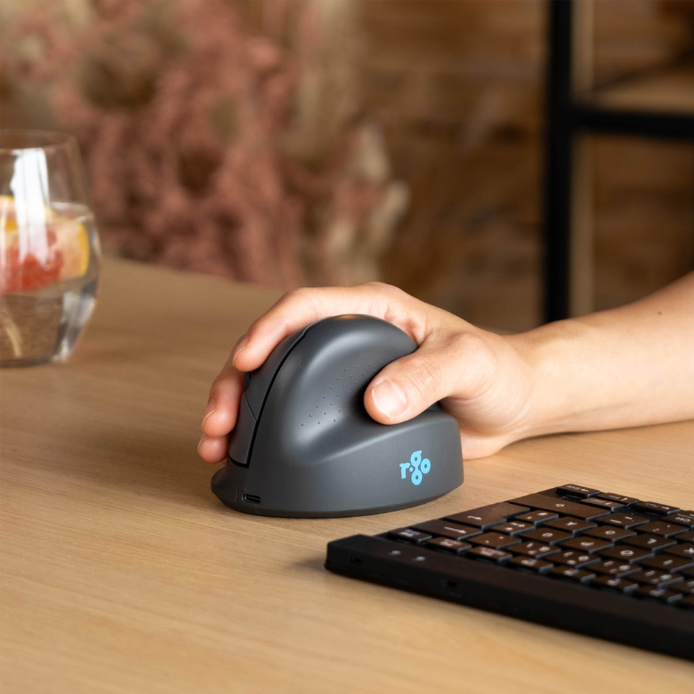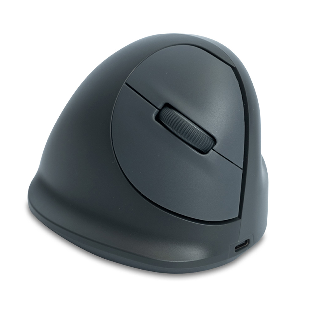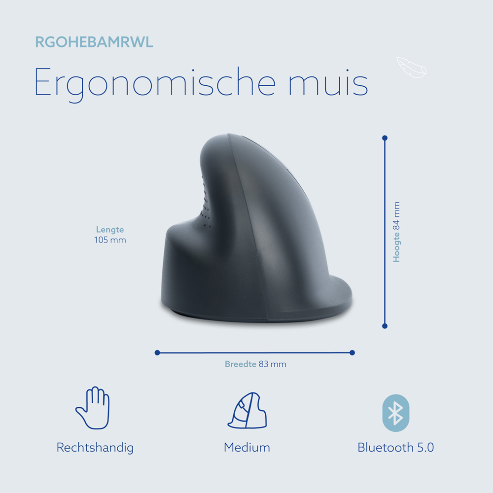 De R-Go HE Basic Verticale Muis is een ergonomische verticale muis die je hand in een natuurlijke “duim-omhoog” houding brengt, zodat je meer vanuit de onderarm beweegt en minder vanuit de pols. Dankzij het ronde design met steunvlakken voor duim en pink ligt de muis comfortabel in de hand. Je verbindt ‘m eenvoudig via Bluetooth en hij kan ook bedraad gebruikt worden via USB-C.